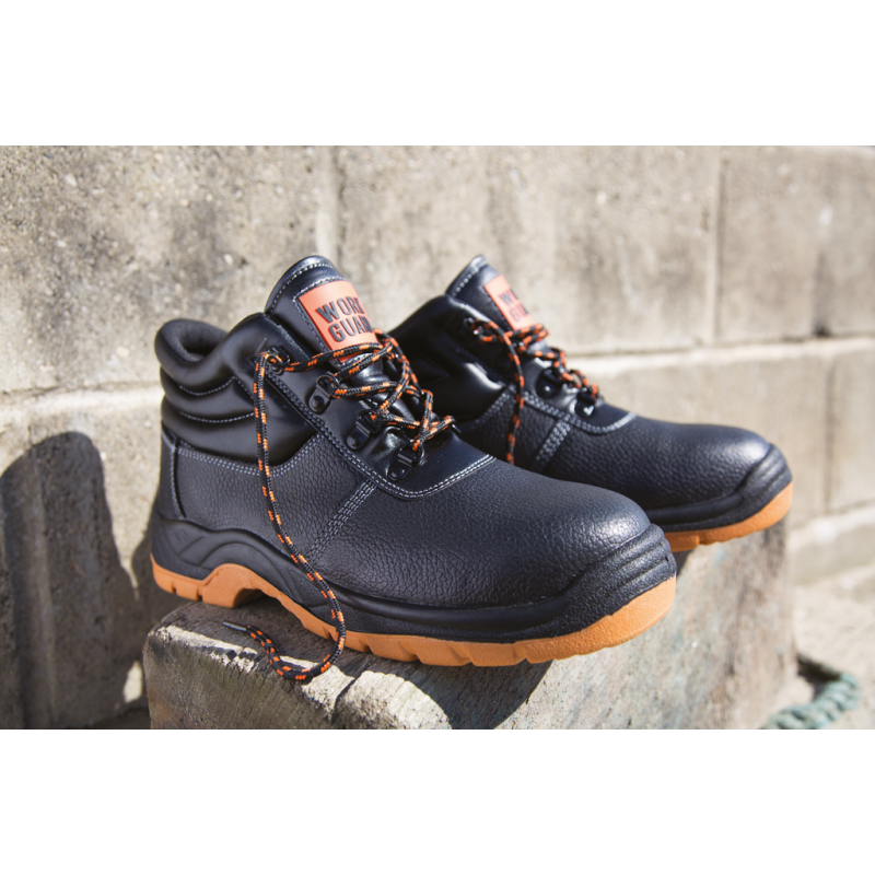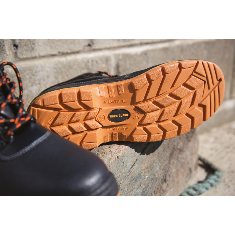 High-top shoe. Black embossed split leather upper. Inner black mesh lining at the ankle. Shiny black eyelets. 3 sets of laces included (Orange, Black and Orange/Black). Duel density PU sole. Steel toe-cap and steel midsole for underfoot protection. Padded collar and tongue. Energy absorption heel. Water resistant leather. Sole resistance to oil. EN 20345:2011 S1P SRA.