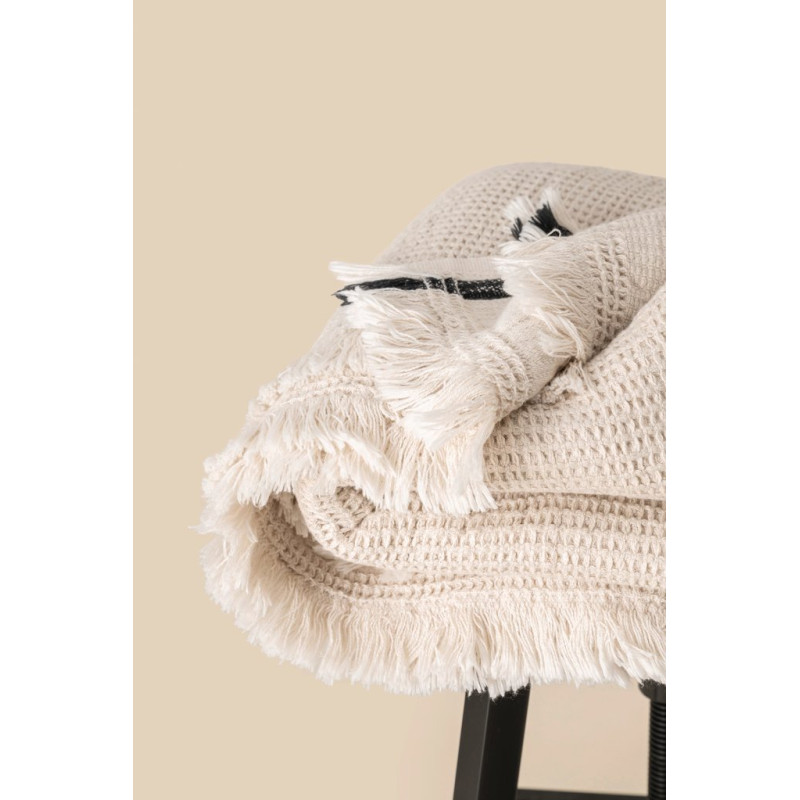 80% cotton, 20% linen. Dimensions: 120 x 185 cm (variations possible depending on the complexity of the weave). Washed product. Textured waffle-weave throw with fringed ends, enhanced by a contrasting band on the sides. Double-sided weave.
