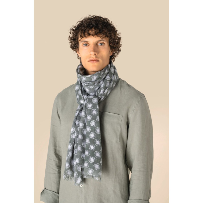 100% cotton. Woven scarf with fringes, decorated with white sunburst motifs on a khaki background. Our hand-woven scarves may vary slightly in colour from one piece to the next, a sign of authentic craftsmanship.
