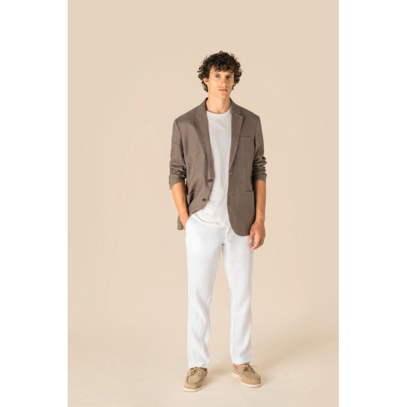 100% linen. Woven fabric. Straight fit, slightly tailored thanks to front darts and two side panels. Unstructured jacket. Washed effect. Two-button front fastening with horn-look buttons. Two patch pockets with welt-style opening on the front and one welt chest pocket on the heart side. Sleeve hems with mock vent and decorative horn-effect buttons. Tailored collar with tone-on-tone mock buttonhole on the heart-side lapel. Inner hanging loop. Centre back seam. Two side slits at the back for greater ease of movement. Two inside welt chest pockets. Premium inner finishes: facing on the front and binding covering the seams. Sleeves are lined. Garment washed after assembly: colour variations may occur from one piece to another.
