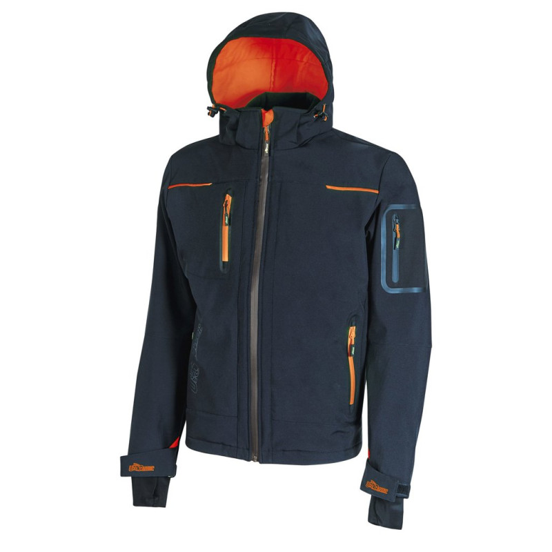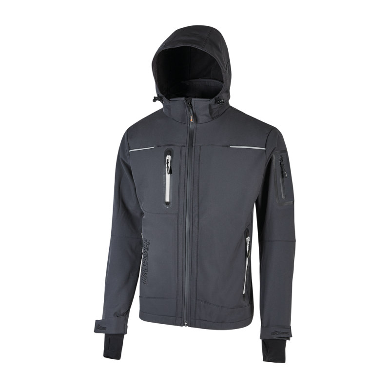 96% polyester/4% elastane. Jacket in Softshell with U-Tex membrane that makes the fabric water resistant, breathable and windproof. Very comfortable and durable jacket with a soft micro-fleece inner lining. Central closure with waterproof zip. Pre-shaped sleeves for optimal fit, adjustable and detachable hood, adjustable Velcro cuffs and stretch windproof cuff with thumb-pass hole. Equipped with two closed front pockets with fluorescent zips and adjustable anti-tangle drawstring inside. A mobile phone pocket on the chest with Free Sound technology closed with a fluo zip. Two large inside pockets. Additional thermowelded pocket on left sleeve. Shaped hem. Reflex tape on collar in the back. Tone-on-tone U-Power logo.