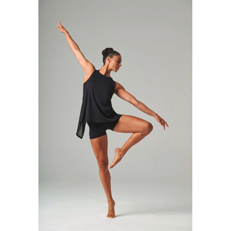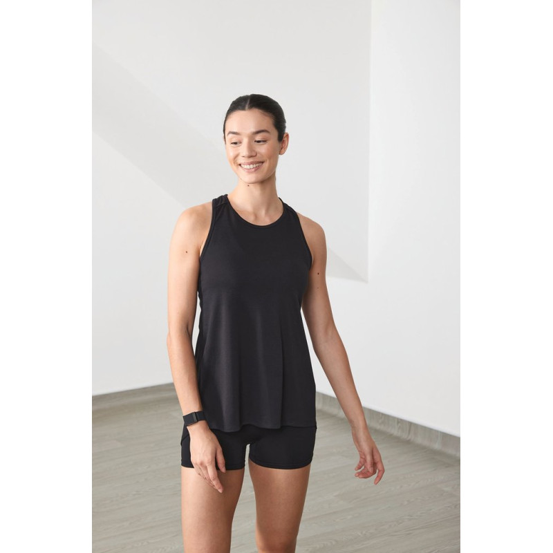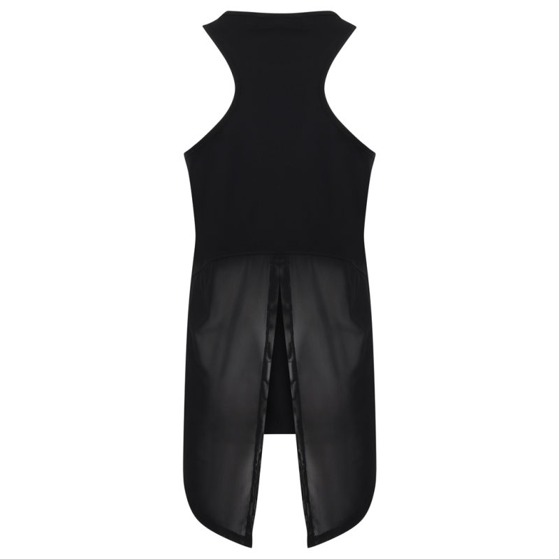 Body:65% polyester/ 35% rayon 145gsm Mesh (90 gsm): 88% Polyester/ 12% Elastane. Vest with soft-touch single jersey fabric. Self-fabric binding at neck and armholes. Wide racer back with forward-facing shoulder seams. Long fine mesh back with split up the middle, which can be worn open or tied up. Curved back section where split begins. Tear-out label.