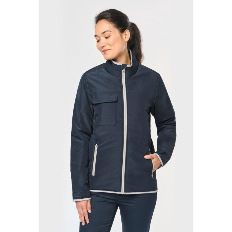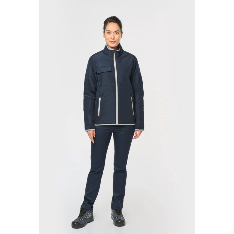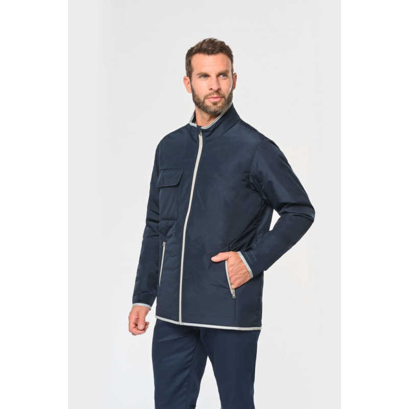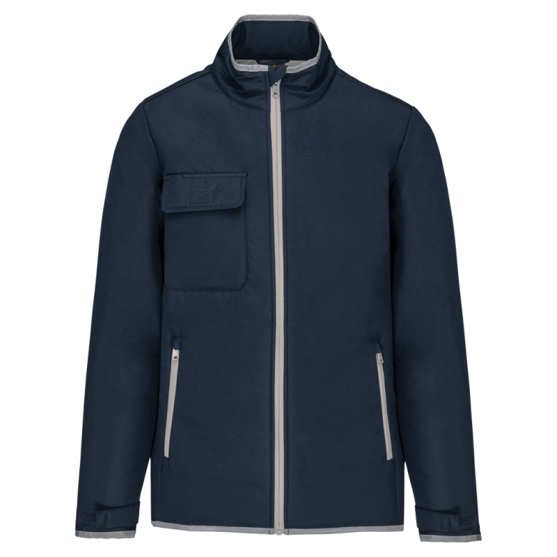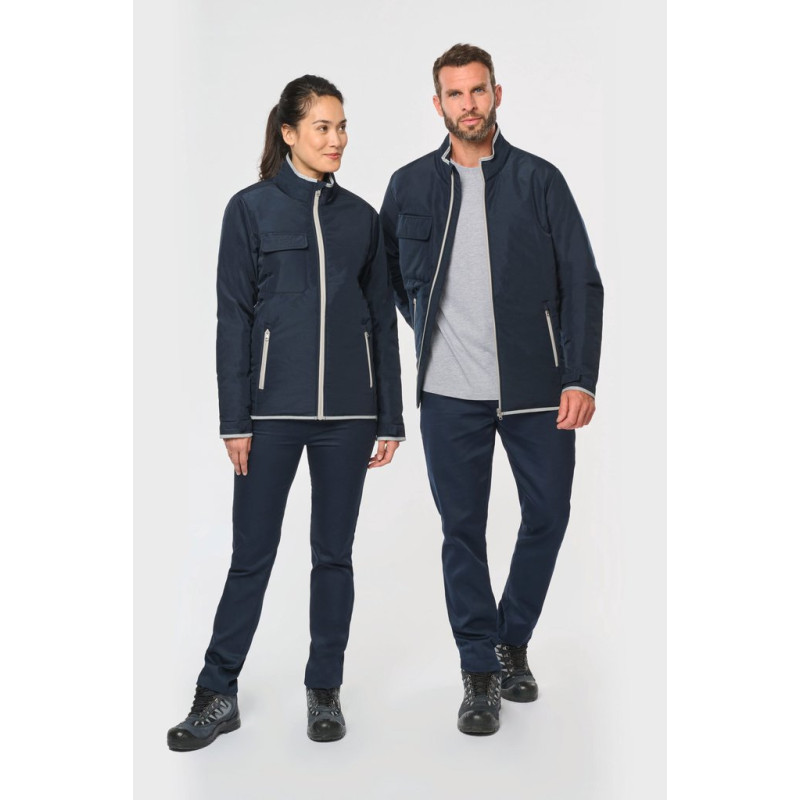 100% polyester. 4 layers: 240T taffeta outer PU membrane. 60 gsm Polyfil. Silver PU membrane inside. Technical performance: 5,000 mm waterproofing and 5,000 wind resistance. Thermal resistance (ISO 11092-2014 Standard) RCT: 0.138 sqm k/w. Straight fit. Nylon zip fastening. 2 side zipped pockets with concealed zip. 1 chest pocket with flap and pen holder, reinforced seam, tear release fastening. Reflective binding on neckline, cuffs and bottom hem. 2 large lower inner pockets. Name tag inside garment. Hanging loop inside neckline. Drop hem. Tear-off brand label for ease of rebranding.