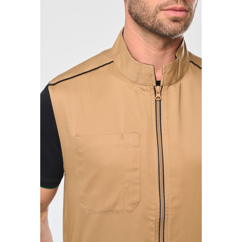 65% polyester / 35% cotton. Washable at 60°C. 1 open chest pocket on right-hand side with pen holder. 1 name label inside. Contrasting zip at centre front and contrasting zipped pockets. Contrasting piping on shoulders. Contrasting inner collar with hanging loop. Ideal for daily use.