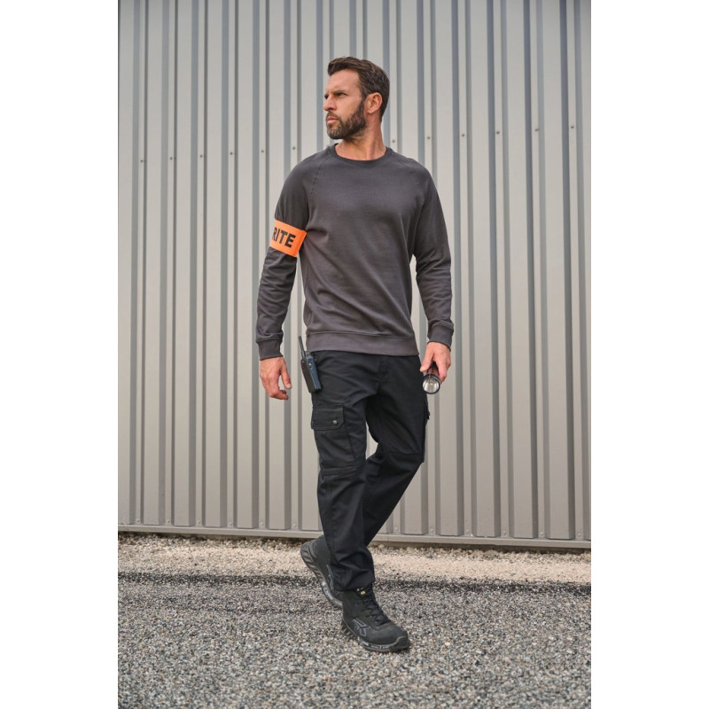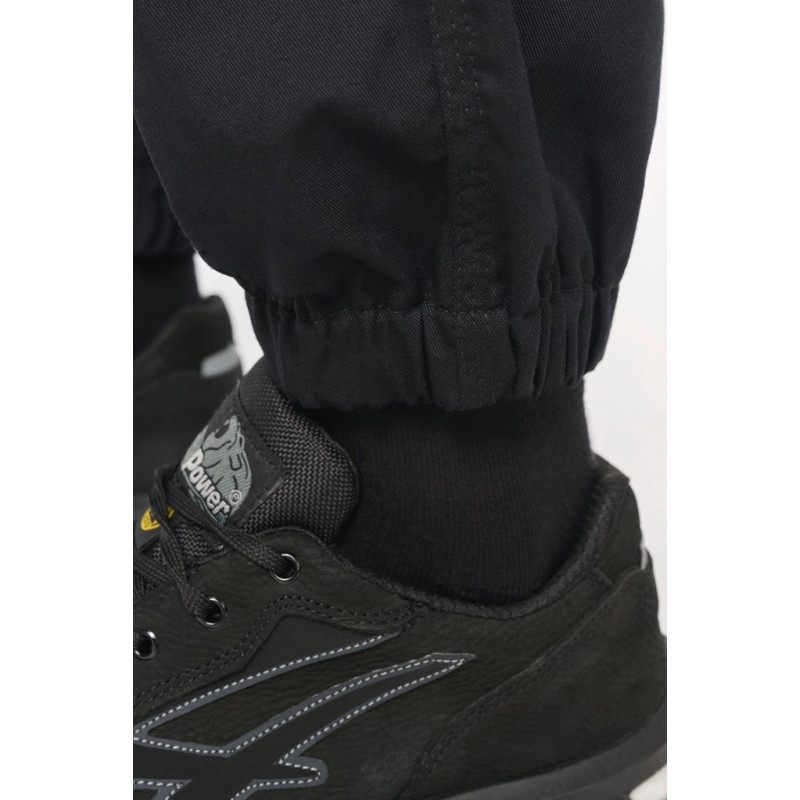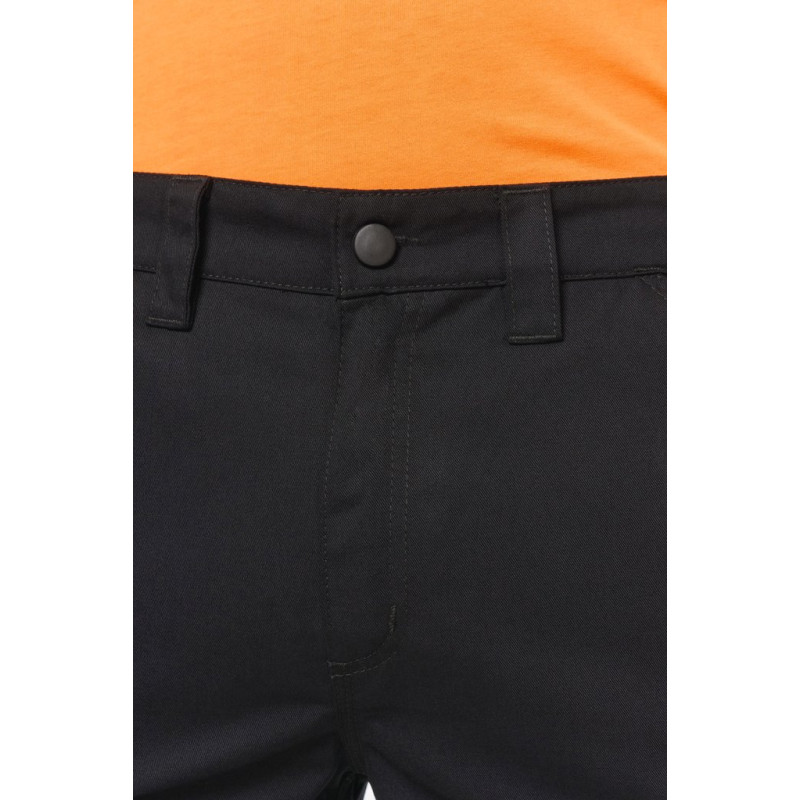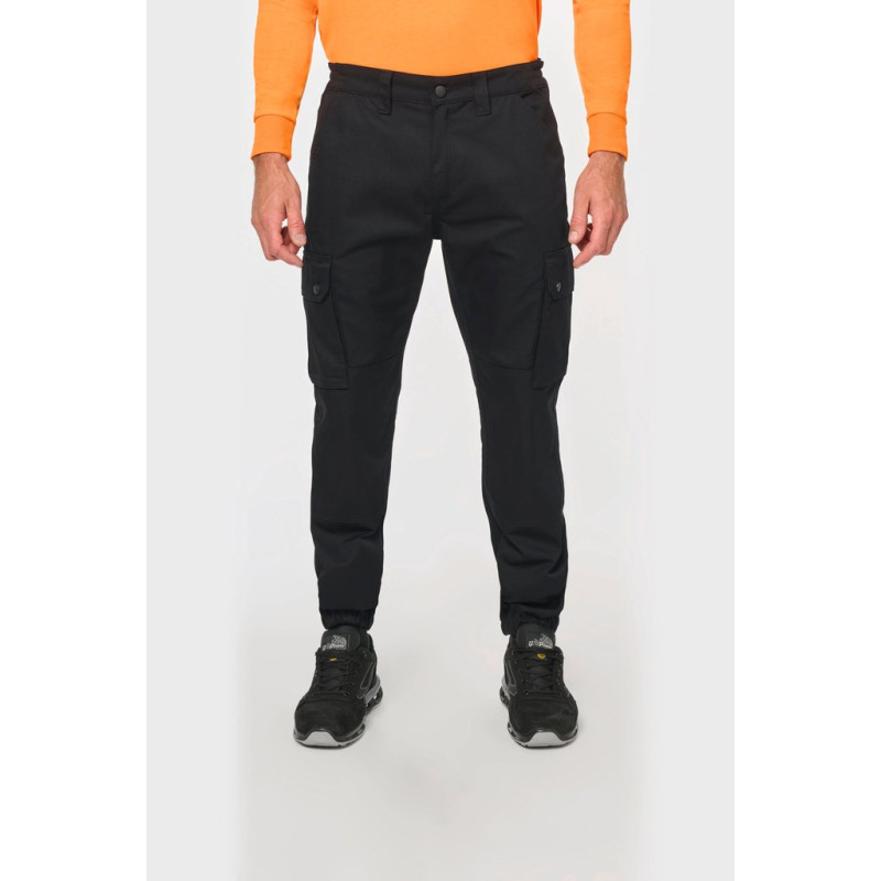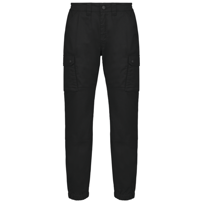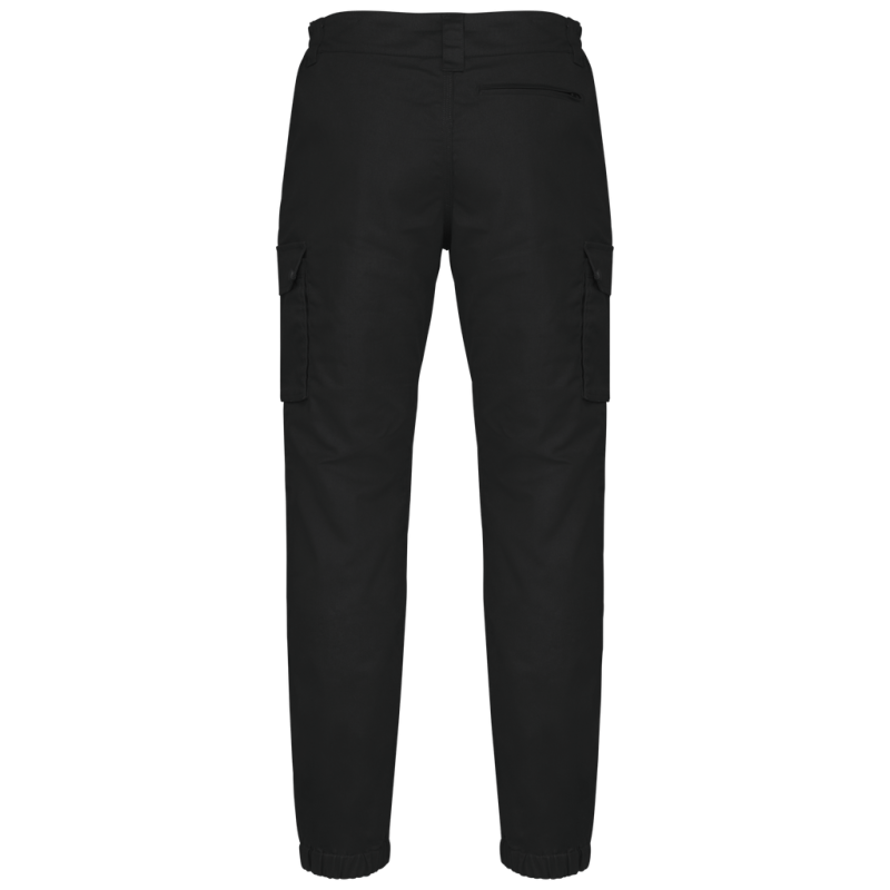 65% polyester / 35% cotton. Twill fabric. Wash at 60°C. Straight fit. 2 front pockets. 2 gusseted side pockets with flaps and press stud fastenings. 1 back piped pocket with zip fastening. Reinforced knee cut-outs in the tone-on-tone main fabric. Elasticated waistband at the sides with reinforced loops, and a higher loop at the middle back (8 cm). Zip and button fastening with plastic button. Elasticated leg hems. Triple stitching at the sides and front and back crotch for extra strength. Detachable brand label.