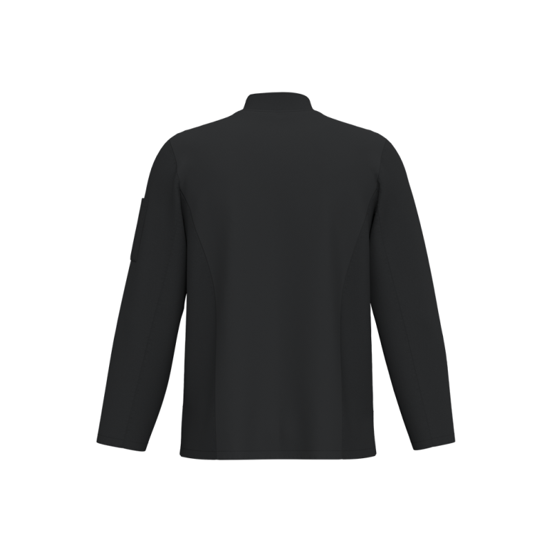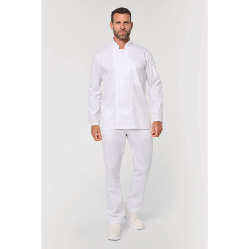 65% recycled polyester / 35% cotton. Twill fabric. Industrial and/or domestic washing at 60°C. Straight fit. Mandarin collar. Matching twill inner taped neck. One piped, topstitched chest pocket and one pen pocket on the sleeve, left side when worn. Cross-over fastening with metal press studs concealed under the placket. Breathable matching mesh back panel. Side slits. Finish on the hem and cuffs. RFID pocket at hem above labels. Detachable brand label.