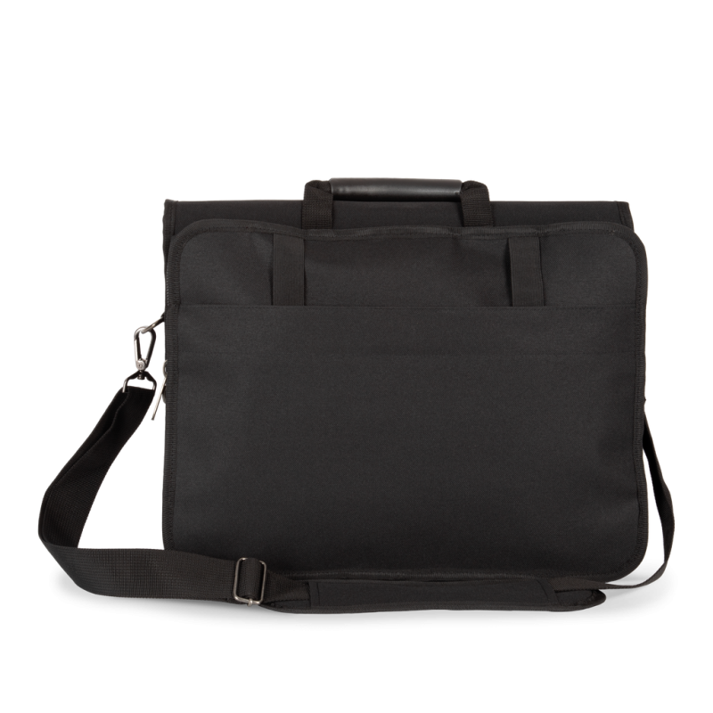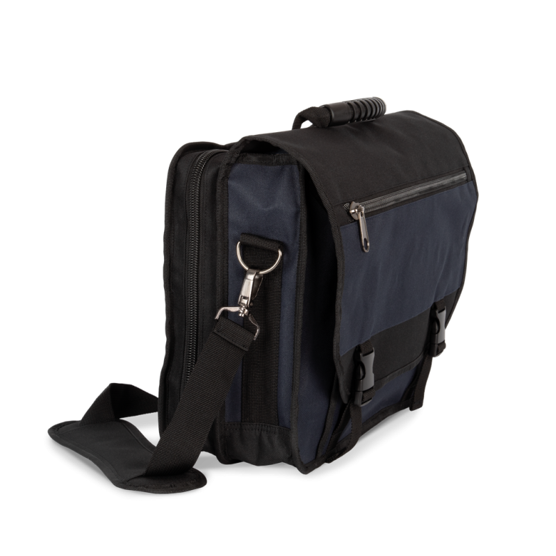 100% polyester. Adjustable shoulder bag. Organised tool compartment with slots for various tools. Flap with front pocket for easy decoration access. Large main compartment to hold documents and a laptop up to 15 inches. The bag is reinforced to bear the weight of appropriate content.