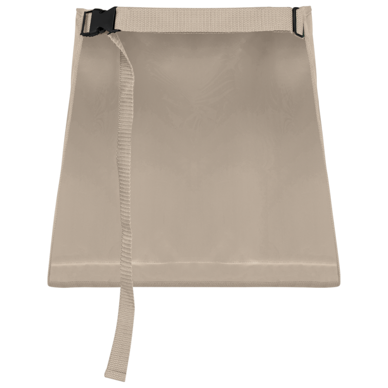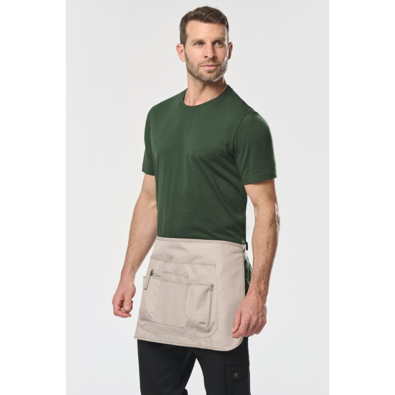 100% polyester. Made from 100% recycled polyester. Coated and waterproof 4000 mm Oxford fabric. 2 levels of pockets: 1 large central pocket + 4 pockets, including 1 with double compartments and 1 with placket and tear release fastening. Matching binding finish. Recycled plastic strap and adjustable buckle to adjust apron size. Total apron height = 35 cm. Apron bottom width = 54 cm. Detachable label.