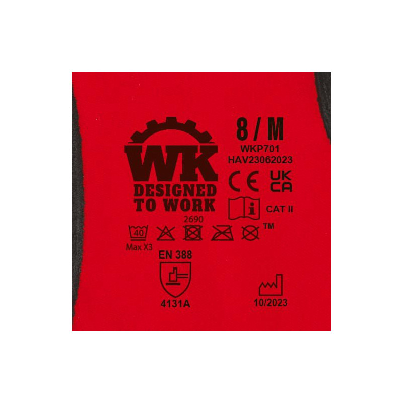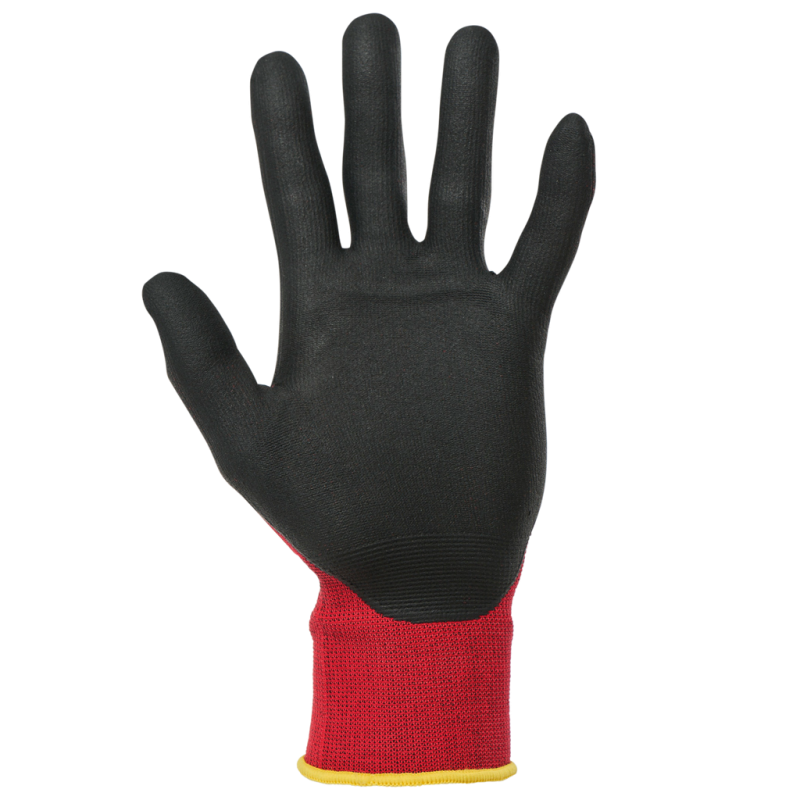 Knitted fabric in polyamide and elastane. 15 gauge. Micro-foam nitrile coating on palm and fingertips. Elasticated cuff with elastic overlock finish in a colour to match the glove size. Washable at 40°C on delicates cycle. PPE Category II. Standards NF EN ISO 21420:2020 (Protective gloves - General requirements and test methods), NF EN 388+A1:2018 (Gloves for protection against mechanical risks): Performance levels 4131A. Weight of a pair of gloves in size 10: 44g