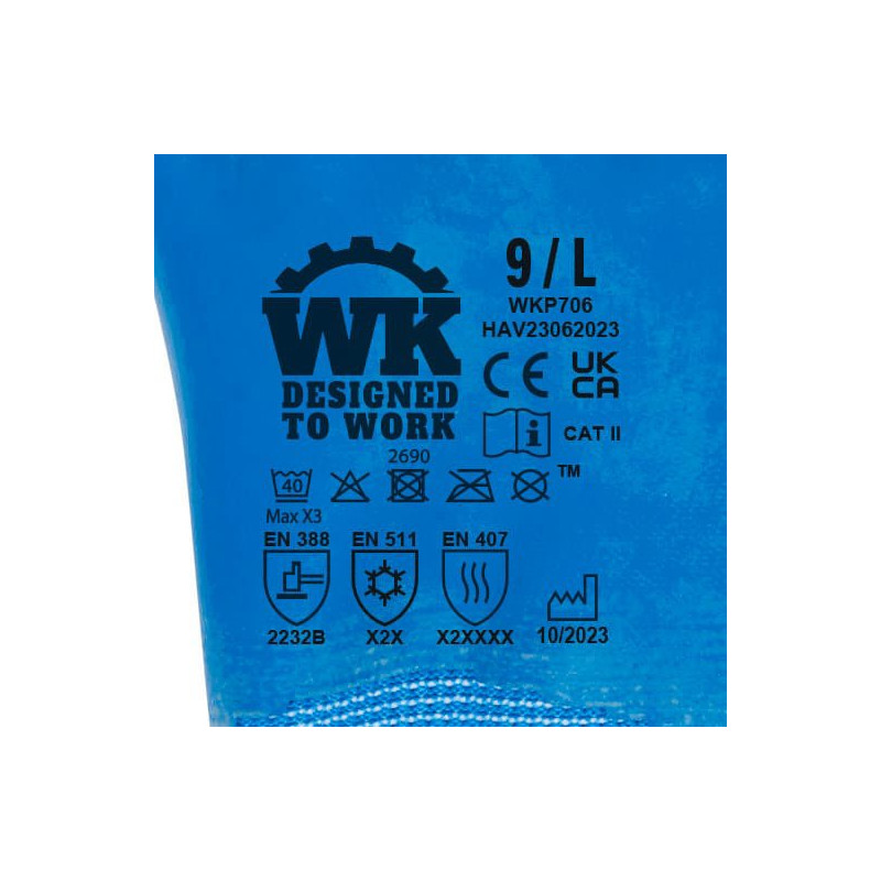 Knitted polyester fabric. Gauge 13. Smooth latex coating on the back of the glove and sandy latex coating on the palm and fingers. Brushed acrylic/polyester inner lining. Elasticated cuff with elastic overlock finish in a colour to match the glove size. Washable at 40° on delicates cycle. PPE Category II. Standards NF EN ISO 21420:2020 (Protective gloves - General requirements and test methods), NF EN 388+A1:2018 (Protective gloves against mechanical risks): Performance levels 2232B, NF EN 511:2006 (Protective gloves against cold): Performance levels X2X, NF EN 407:2020 (Protective gloves and other equipment to protect hands against thermal hazards (heat and/or fire): X2XXXX performance levels. Weight of a pair of gloves in size 10: 152g