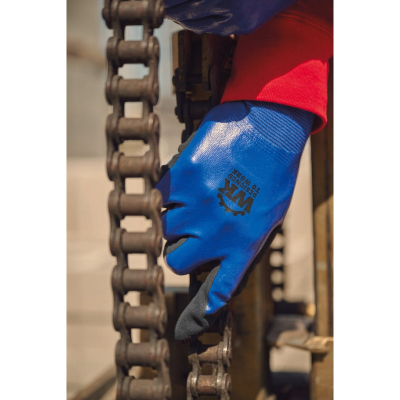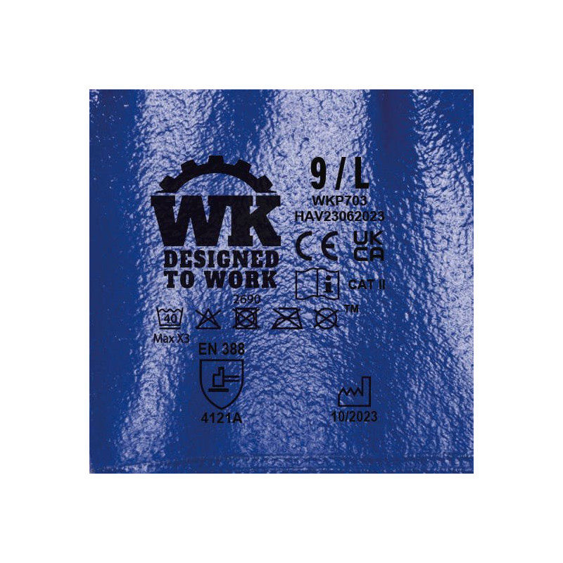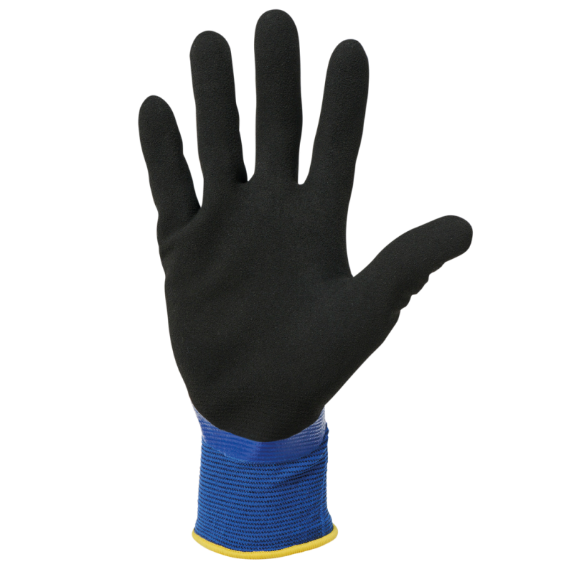 Knitted fabric in polyamide and elastane. Gauge 18. Smooth nitrile coating on the back of the glove and sandy nitrile coating on the palm and fingers. Elasticated cuff with elastic overlock finish in a colour to match the glove size. Washable at 40° on delicates cycle. PPE Category II. Standards NF EN ISO 21420:2020 (Protective gloves - General requirements and test methods), NF EN 388+A1:2018 (Gloves for protection against mechanical risks): Performance levels 4121A. Weight of a pair of gloves in size 10: 84g