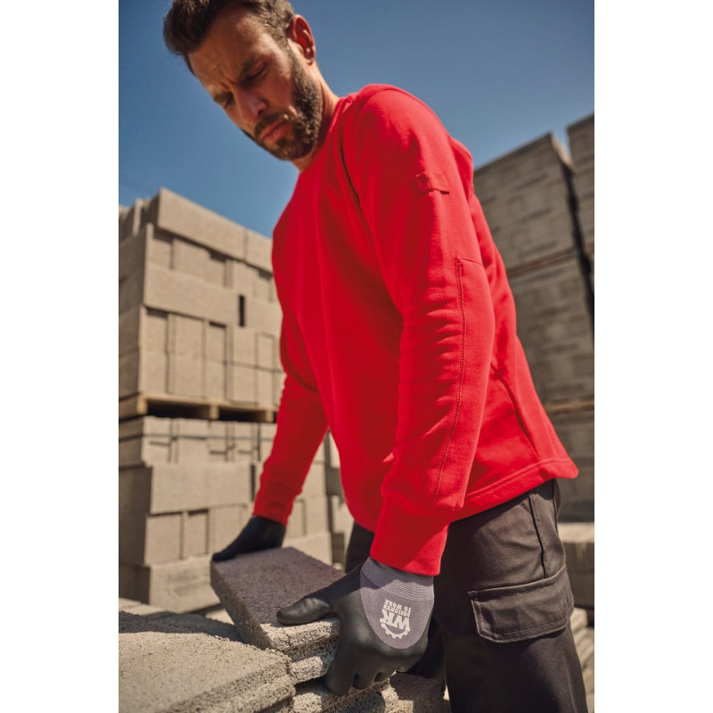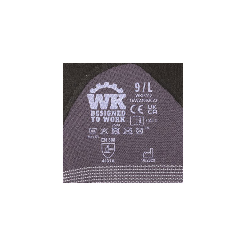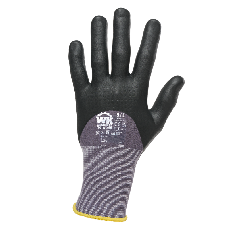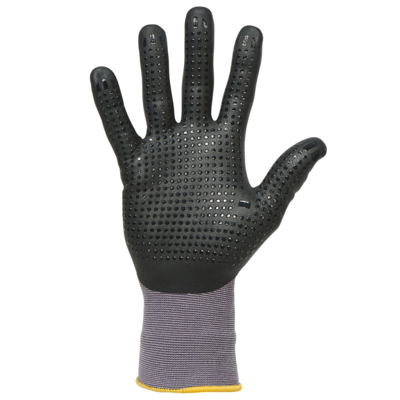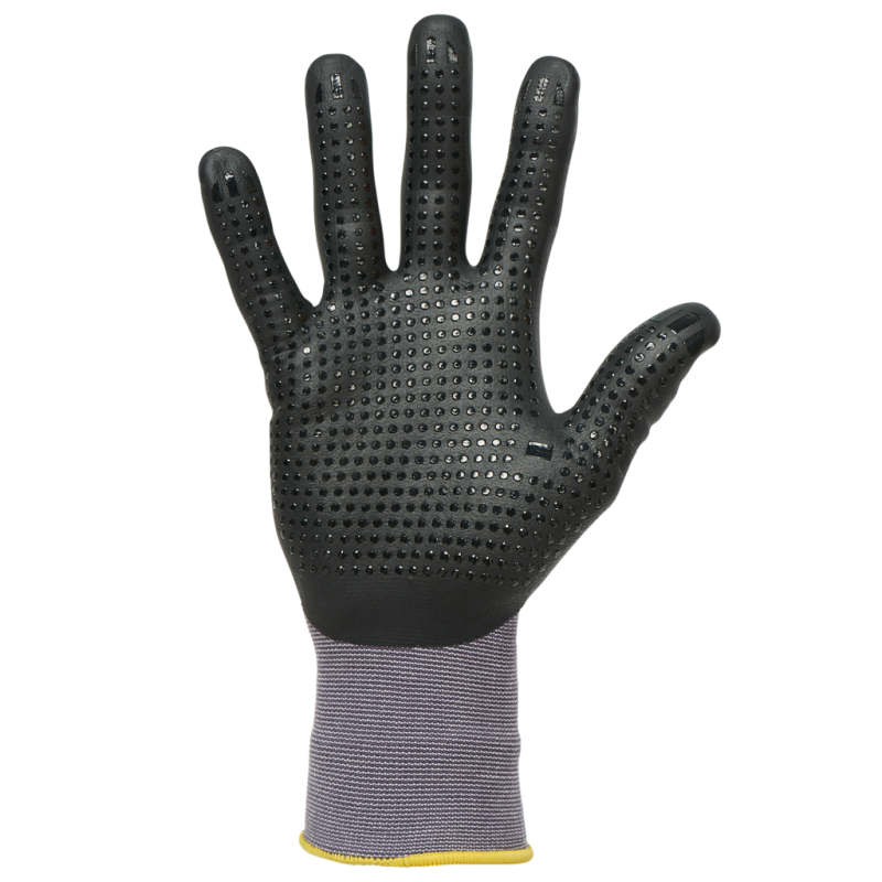 Knitted fabric in polyamide and elastane. 15 gauge. Micro-foam nitrile coating on palm, fingers and the 3/4 back of the hand. Nitrile dots on palm and finger insides. Elasticated cuff with elastic overlock finish in a colour to match the glove size. Washable at 40° on delicates cycle. PPE Category II. Standards NF EN ISO 21420:2020 (Protective gloves - General requirements and test methods), NF EN 388+A1:2018 (Gloves for protection against mechanical risks): Performance levels 4131A. Weight of a pair of gloves in size 10: 48g