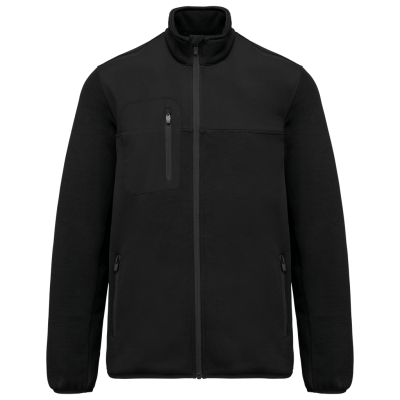 100% recycled polyester. Brushed tricot knit. Machine wash at 40°C. Contrasting 2-layer 100% polyester softshell inserts with water-repellent treatment on the upper body, front and back, sides, and underarms. Zipper closure with chin guard. 2 zipped side pockets. 1 contrasting zipped chest pocket on the right side when worn. 2 inner pockets. Contrasting bias binding at the bottom of the sleeves and hem. Removable brand label.