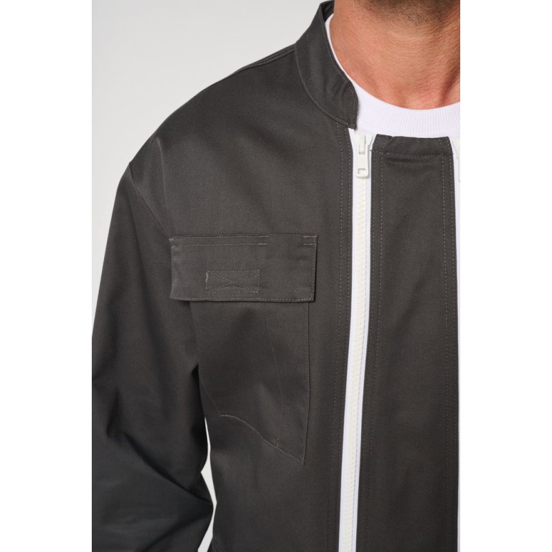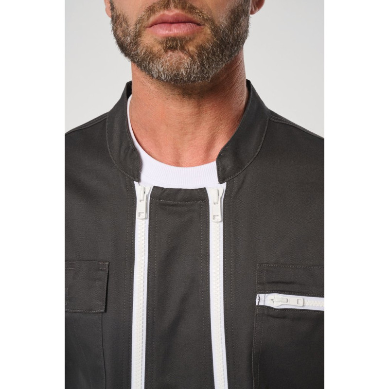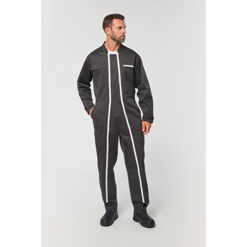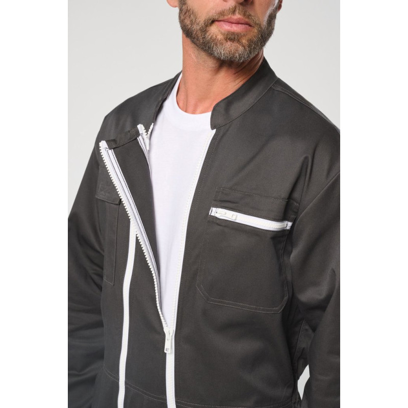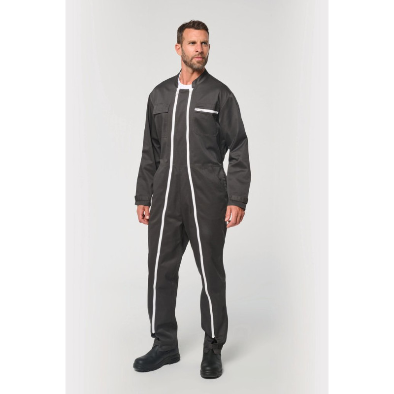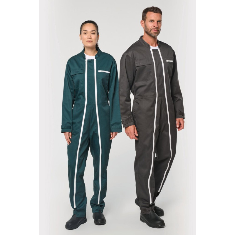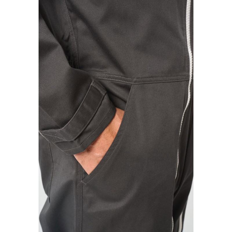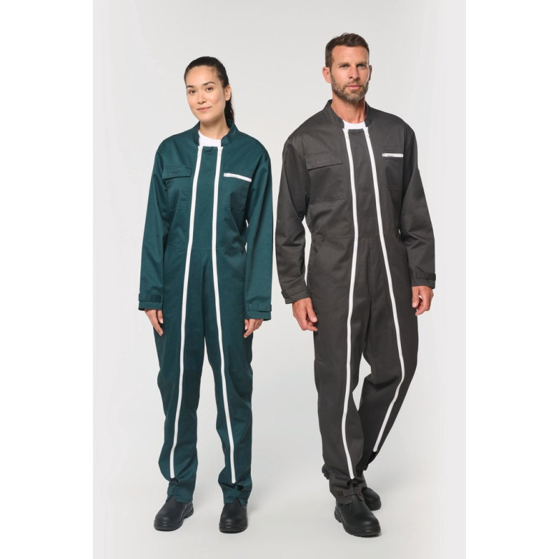 65% polyester / 35% cotton. Twill fabric. Washable at 60°C. Patch chest pocket closed by a flap with tear release fastening. Patch zipped chest pocket with plastic zip and white metal zip head. Two side pockets with openings for easy access to the pockets of garments worn underneath. A patch pocket on the side of the right thigh. Back patch pocket. Plastic double zip fastening with white metal zip heads. Back yoke with two pleats for greater comfort and freedom of movement. Waist adjusted by elasticated belt. Double-stitched sides, sleeves and crotch. Triple-stitched crotch back. Adjustable cuffs and leg hems with tear release fastening. Leg and cuff hems. Detachable brand label.