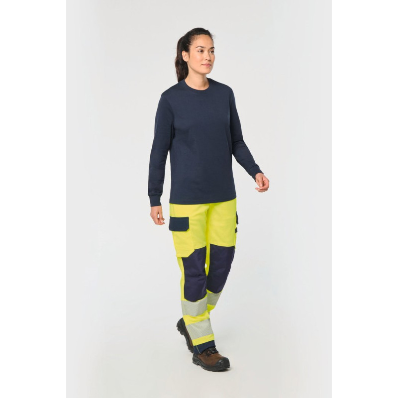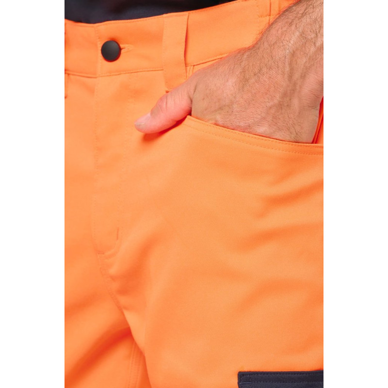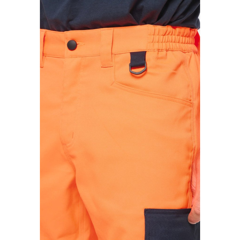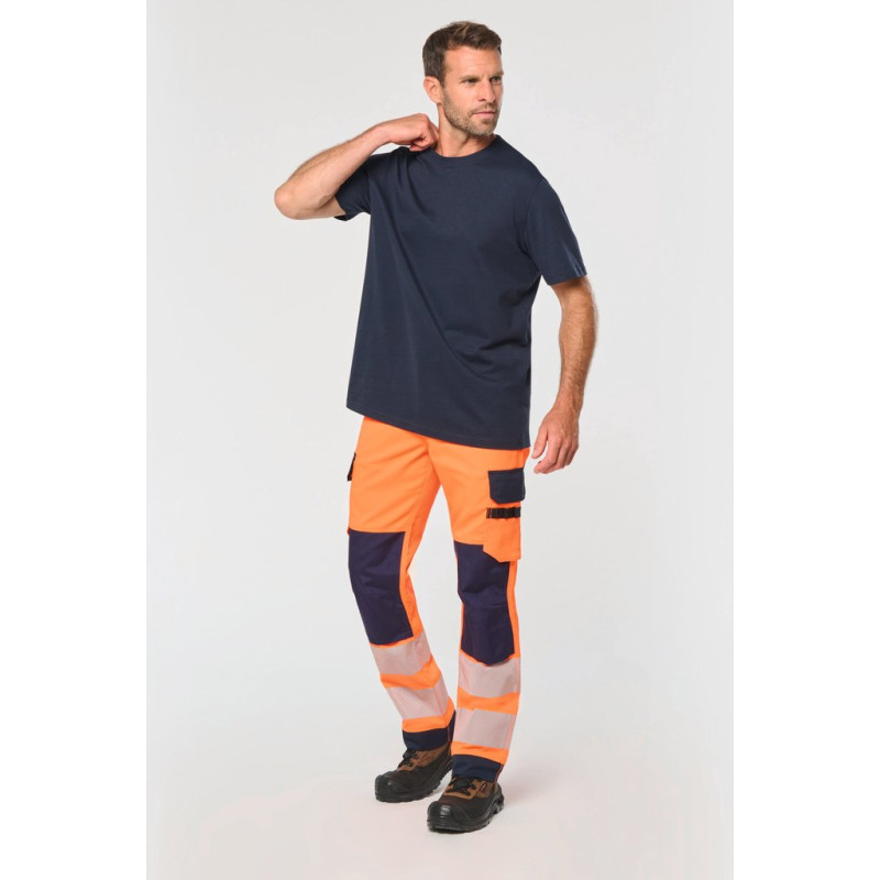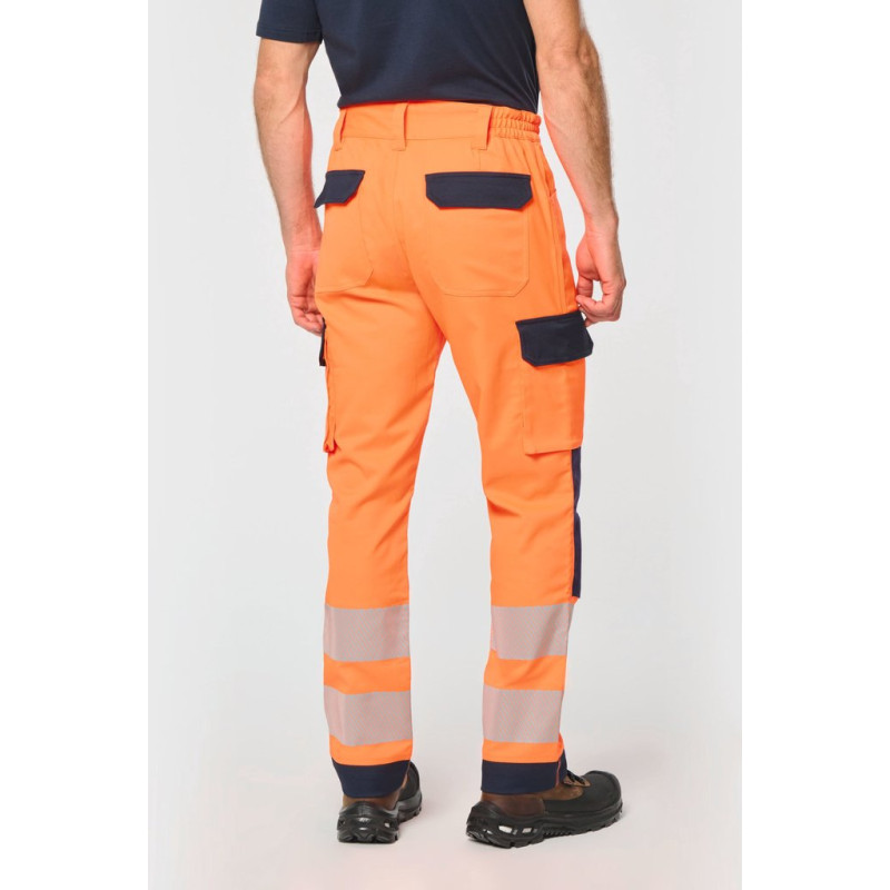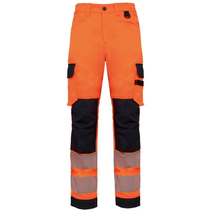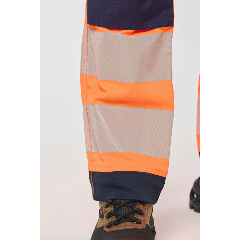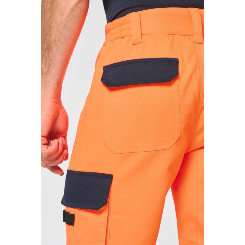 60% recycled polyester / 36% cotton / 4% elastane. Twill fabric. Water repellent treatment. Wash at 60°C (25 cycles). 2 front pockets + 1 ticket pocket on the right side. 2 gusseted cargo side pockets with contrasting flaps and tear release fastenings. 1 patch pocket with pen/tool holder on the left side pocket when worn. 2 back patch pockets with contrasting flaps and tear release fastenings. Attached plastic ring on front left belt. 2 x 100% polyamide contrasting Cordura® knee pad pockets (knee pads not included) with tear release fastening and inner flap to secure and adapt the knee pad. 2 x 8.5 cm segmented retro-reflective strips and contrasting cut-outs on lower legs. Elasticated belt at sides with belt loops, 1 of which is wide and reinforced at centre back. Zip fastening and plastic-covered button. Triple stitched crotch, sides and rib, front and back. 5 cm adjustable hem. Certifications in progress: PPE Class II. Standards NF EN ISO 13688:2013 + NF EN ISO 13688/A1:2021 (Protective clothing - General requirements), NF EN 14404-1:2024 + NF EN 14404-3:2024: Level 1U only in combination with WKP150 knee pads (Personal protective equipment - Knee protectors for work on knees), NF EN ISO 20471:2013 + NF EN ISO 20471/A1:2017: Class 2 (High Visibility Clothing - Test Methods and Requirements), RIS-3279-TOM Issue 2:2019 for Hi Viz Orange/Navy colour only (Railway Industry Standard). Detachable brand label.