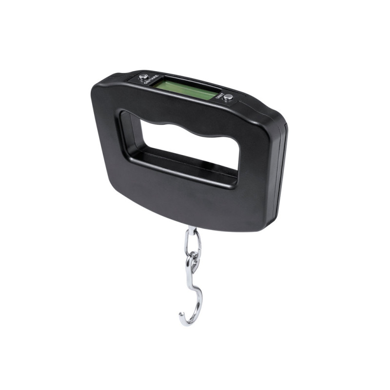 Portable handheld digital scale. Ergonomically designed to fit in the hand and facilitate the viewing of its LCD screen. With ON/OFF button, TARE function, and various units of measurement: grams (g), kilograms (kg), pounds (lb) and ounces (oz). With metal hook for an easy weighing of the objects, and a maximum weight of 50kg. Includes instructions in English and Spanish and is powered by 2 AAA batteries (not included). Individually packaged in a kraft design box.