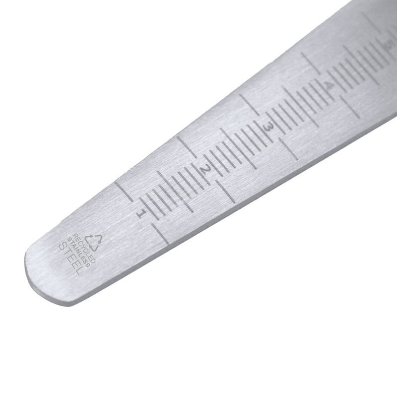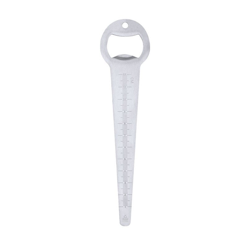Seed depth gauge with opener made of Recycled Stainless Steel. Horizontal ruler meter with scales in millimeters and centimeters, from 1 to 12, starting at 1.2 cm from the base. With Recycled Stainless Steel badge.