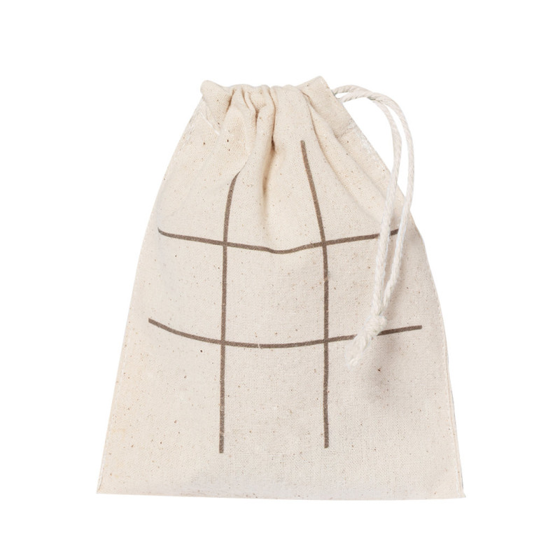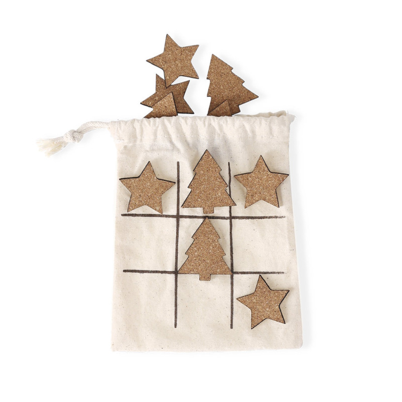 Tic-tac-toe game made of natural cork. Including 5 tree-shaped tokens and 5 star-shaped tokens. Presented in a cotton bag with drawstring closure to be used as game board.Made with plant-based elements to promote the use of natural raw materials and reduce polluting emissions.
