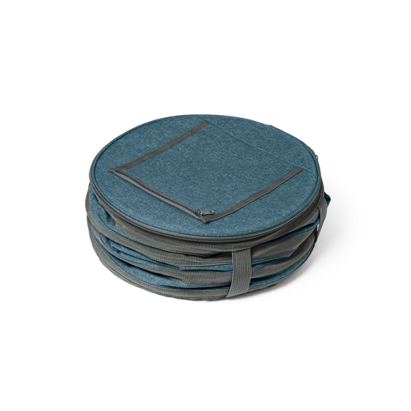 600D foldable cooler bag with double zipper and PEVA lined interior. Top zipped pocket and reinforced webbing straps. Includes bottle opener. The cooler has a capacity of up to 15 L. ø300 x 260 mm