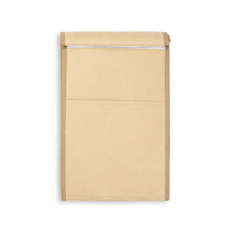Paper cooler bag with adhesive closure, which keeps food fresh and well stored. Its unique design makes it easy to transport and store.Outer material: paper, with non-woven inner reinforcementThermal insulation: aluminum filmCapacity (L): 4Compartments: 1 padded main compartmentOuter pockets: 1 front pocketDimensions: Closed: 195 x 350 x 110 mm | Open: 195 x 410 x 110 mm