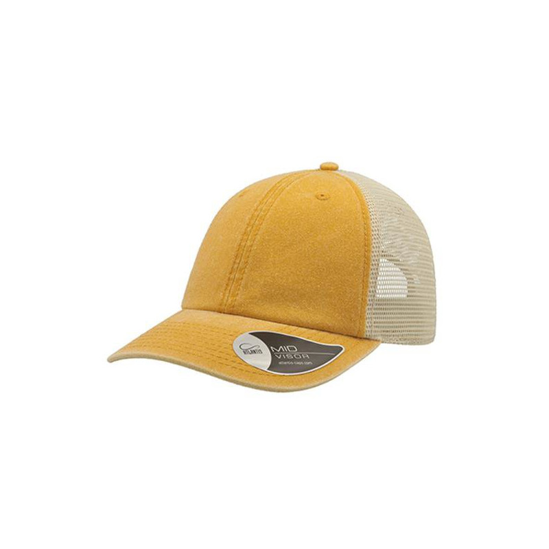The popular shape of the trucker cap transformed into a cap with a casual, vintage style. Pigment-dyed caps are colored using a special powder capable of creating a washed-out effect. This method doesn´t actually dye the material, but only colors the outer layer, unlike traditional dyes which penetrate the fabric completely. Main fabric 100% cotton chino, back and sides 100% polyester. Half-curved visor, 6 panels, stitched eyelets, 8 seams on visor, removable label, Velcro closure.