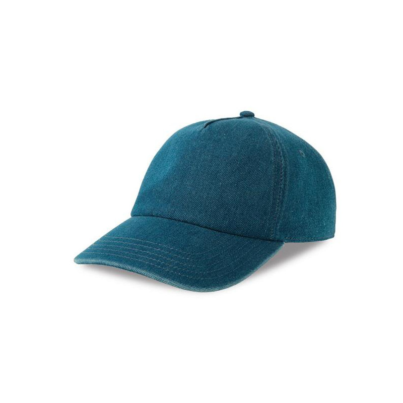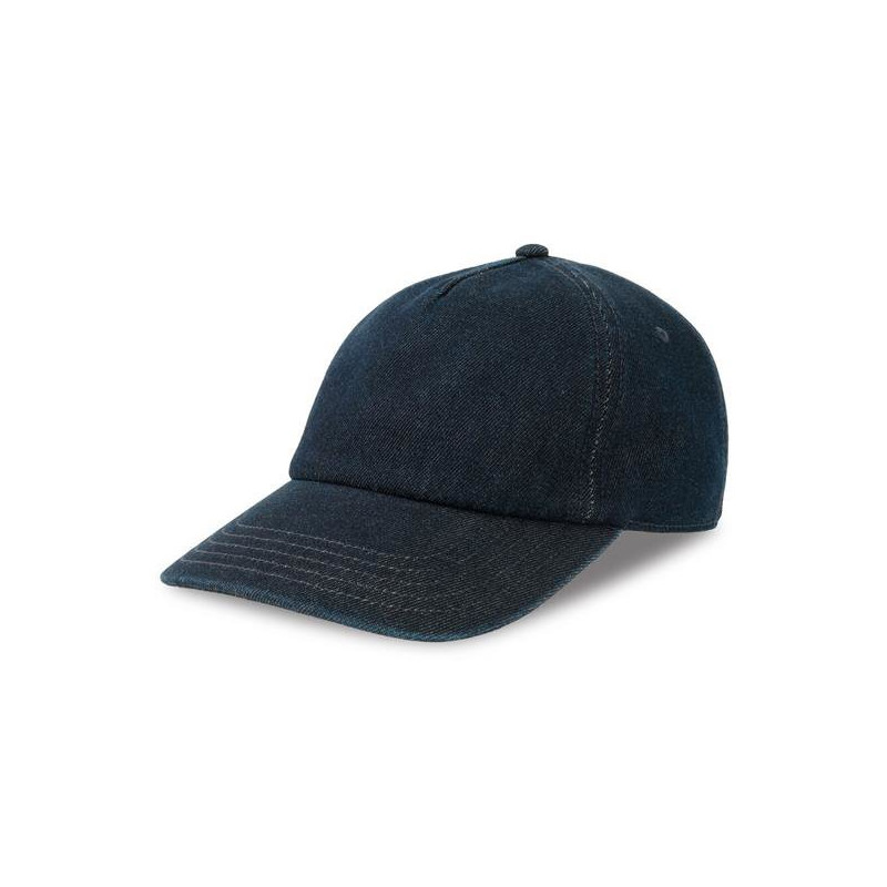 Baseball cap in 50% cotton and 50% recycled Cotton denim, unstructured with 5 panels. Made from recycled cotton, dyed with DyStar® Indigo technology, which reduces water, energy, and chemical consumption compared to traditional denim dyeing methods. The 5-panel construction and tone-on-tone stitching increase its customisation potential. It features an internal organic cotton band and a metal buckle closure.