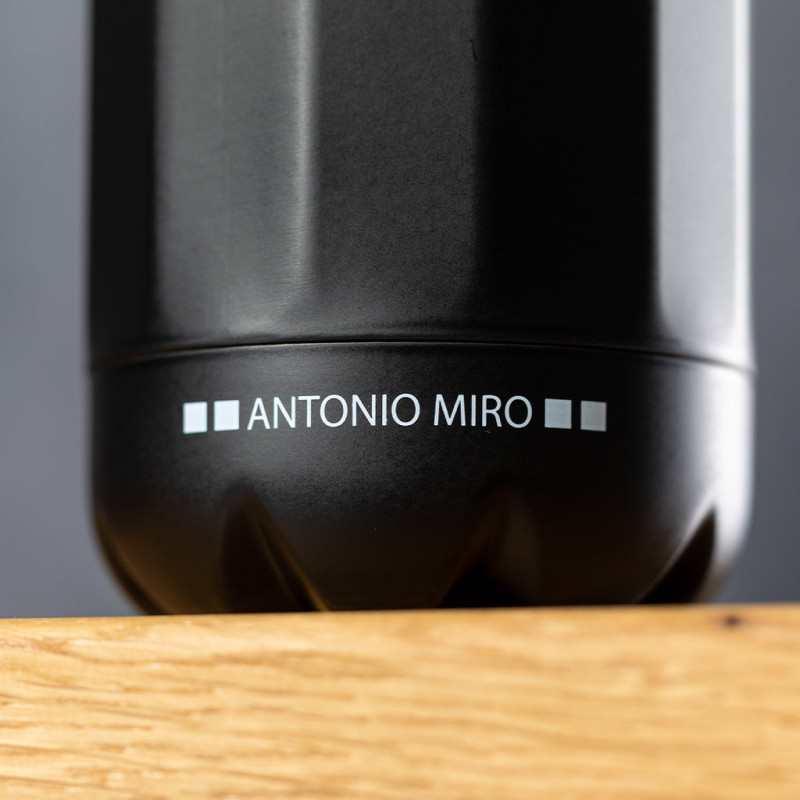 Stainless steel bottle by Antonio Miró. 750ml capacity and sober satin black finish, with prism body and brand logo at the base. Chromed screw-on lid and presented in an attractive design box with brand logo.