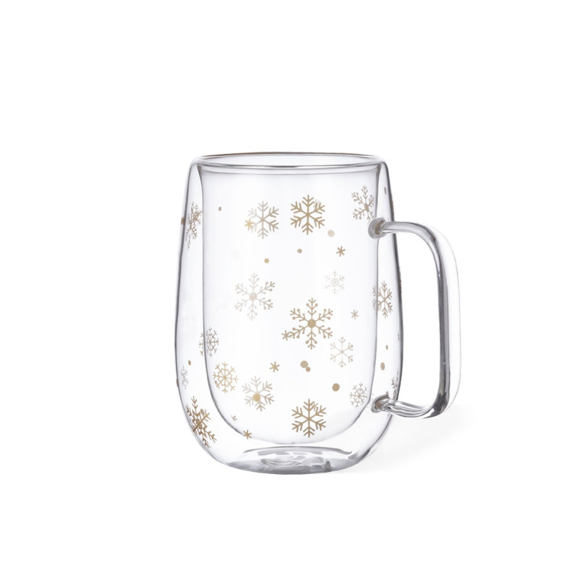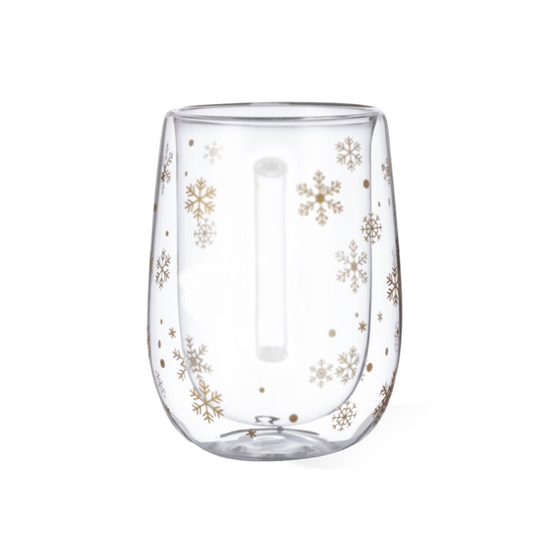 400 ml double wall thermal mug. With original snowflake design and special branding area at the front. Made of borosilicate glass, which offers exceptional strength and durability, extending its lifespan and making it reusable countless times.Presented in a black design box with a golden illustration.