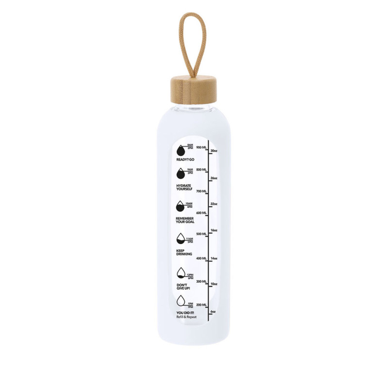 1L glass bottle designed to encourage proper hydration. Covered with a silicone sleeve that protects and provides a comfortable and secure grip. Includes capacity indicator in liters and ounces, accompanied by motivational phrases that inspire maintaining proper daily hydration. The cap, made from bamboo, includes a convenient cord for easy transport. BPA-free.