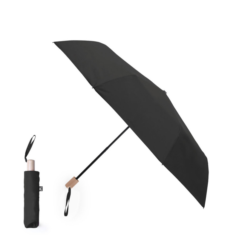 Nature line folding umbrella of 95 cm diameter. In 190T pongee RPET material, obtained from recycled plastic materials, to encourage the reusing of plastic residues and contribute to the Earth’s sustainability. Manual opening, with windproof mechanism and metal ribs. Wooden handle, with carrying straps and pouch in matching colors. RPET distinctive label.