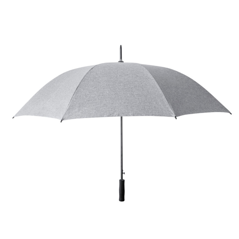 High quality 130cm diameter umbrella. Made of durable 150D polyester material and in an elegant marbled grey tone. Automatic opening and fibreglass ribs, with windproof system and velcro closure. With ergonomic handle in soft EVA and presented in a recycled bag.
