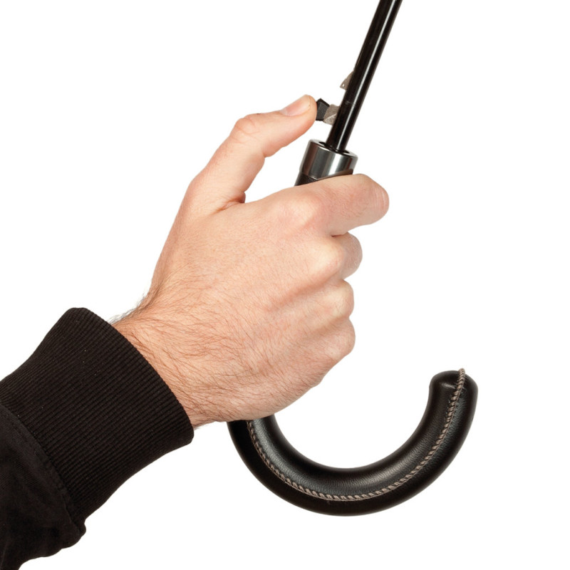 Umbrella by Antonio Miró with 8 panels, in an elegant black color design with white piping. 100cm in diameter, with automatic opening and in in resistant pongee material. With metal ribs in black color, velcro closure and handle with soft touch in PU leather. Includes a closure strap with adjustable fastening and the brand's logo.