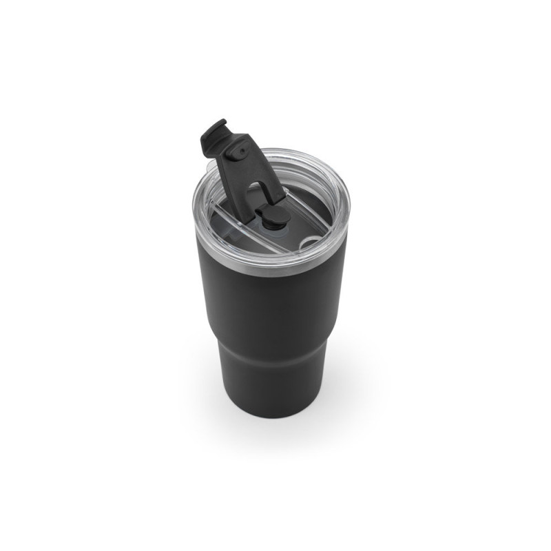 Compact, easy-to-use travel cup for your trips and outdoor activities. Made from stainless steel (91% recycled), it has a vacuum-insulated double wall and a matt finish. This cup can be used in two ways: through its straw opening (included) or through the hole for direct use (can be covered). Capacity up to 600 mL. Supplied in a kraft paper gift box. ø86 x 168 mm (without straw) | Straw: 205 mm