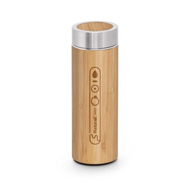 Bamboo and stainless steel (90% recycled) thermal bottle with vacuum double body and tea infuser. This bottle has a capacity up to 430 mL and is supplied in a gift box. As the product is made from natural materials, the colour and the printing result may vary between products. ø69 x 207 mm | Box: 72 x 210 x 72 mm