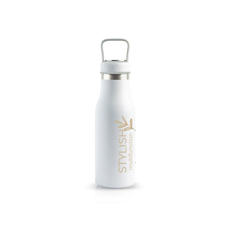 Thermos with compartment in the lid. A bottle that keeps liquids hot or cold for several hours. Ideal to take with you anywhere, whether on a daily basis at work or even to the gym. The deposit in the lid allows you to store a great versatility of things, including pills, supplements or flavor for your water, or even the key to the locker´s lock so you don´t lose it while you train.