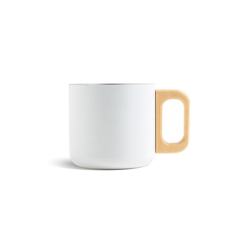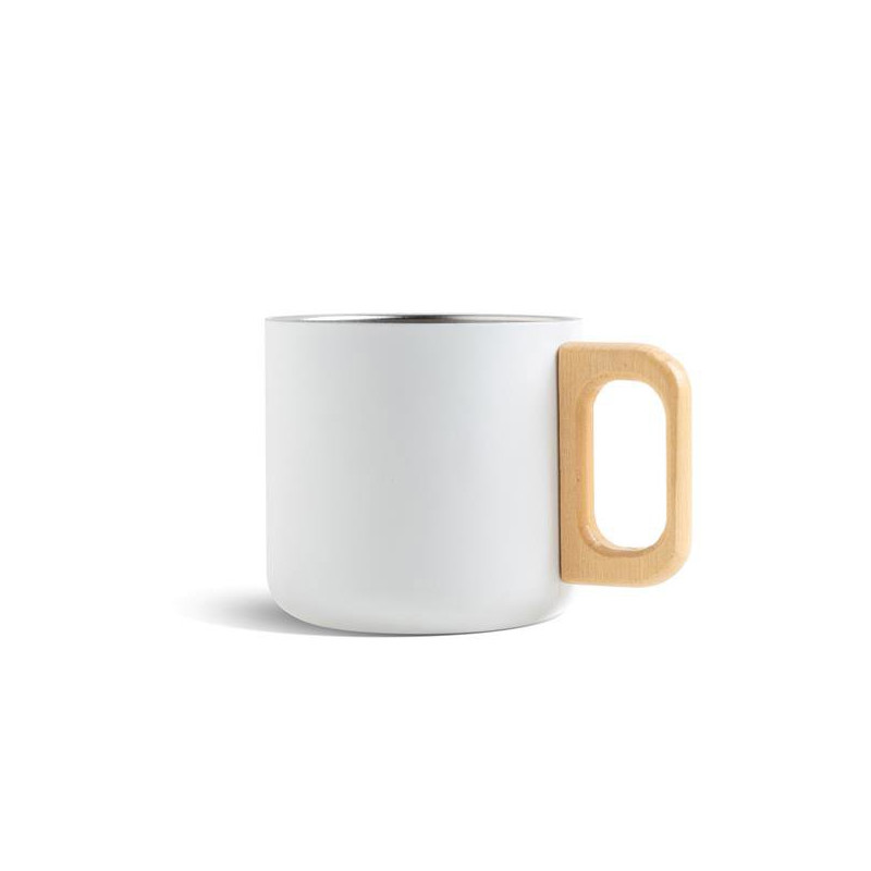 350 ml Stainless Steel Mug with Double Wall and Wooden Handle. This mug is ideal for enjoying hot beverages, thanks to its double-wall design that keeps the temperature for longer. The combination of materials blends rustic and elegant elements, making it a sophisticated and unique gift. With a capacity of 350 ml, it adds a special touch to the experience of enjoying your favorite drink, combining both functionality and style.