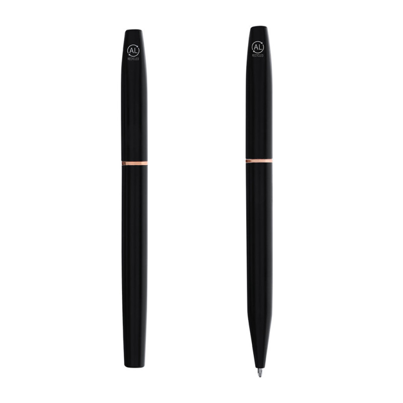 Ball pen and roller pen set made of Recycled Aluminium, in elegant matte black design with distinguished pink gold fittings. Twist mechanism ball pen and roller pen with cap, both with metal clip. In blue ink and with Recycled Aluminium logo. Presented in an elegant black case.Recycled Aluminium is a material with almost infinite recycling possibilities, without losing its original properties and consuming less energy in the process.GRS (Global Recycled Standard) certification, guaranteeing the recycled origin of the material used to manufacture the product.
