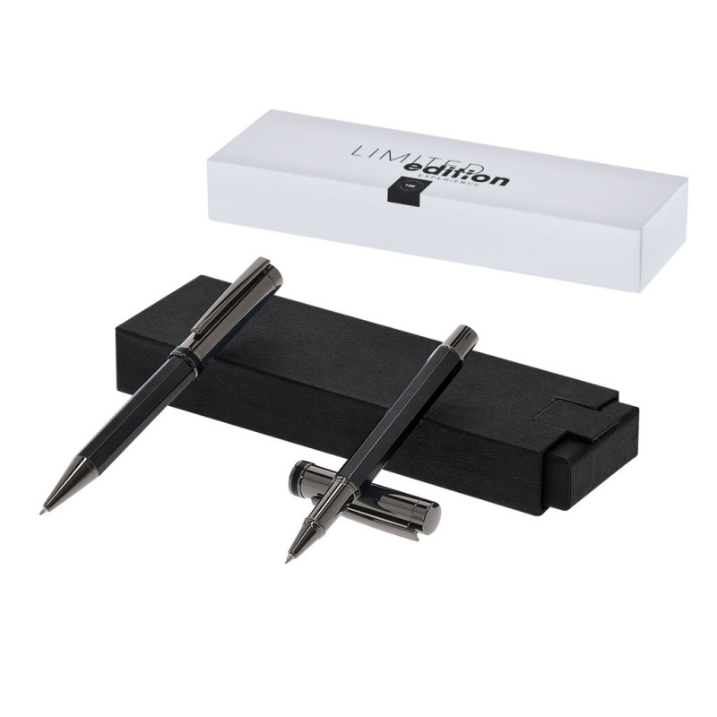 Exclusive ball pen and roller pen set of the highest quality from the Limited Edition collection. A modern, functional and gorgeous accessory that transcends all expectations. Distinguished by its elegant, minimalist design. Made in strong, durable stainless steel, in perfect combination with aluminium. Ball pen with sophisticated twist-open system and roller pen with a practical cap. Hexagonal grip design in matt metallic colours and a sober antrhacite glossy top. With metal clip, blue ink and refillable (roller pen with jumbo cartridge).From the perfect combination of exclusivity and design, come Limited Edition, a special collection of limited edition promotional ideas. A new concept, inspired by the fusion of premium products with the latest and most innovative trends and with a limited selection available, turn a gift into a unique and unforgettable experience.Exclusive Limited Edition presentation case, with a design protected by industrial property rights.Including card with description of Limited Edition in recycled cardboard.