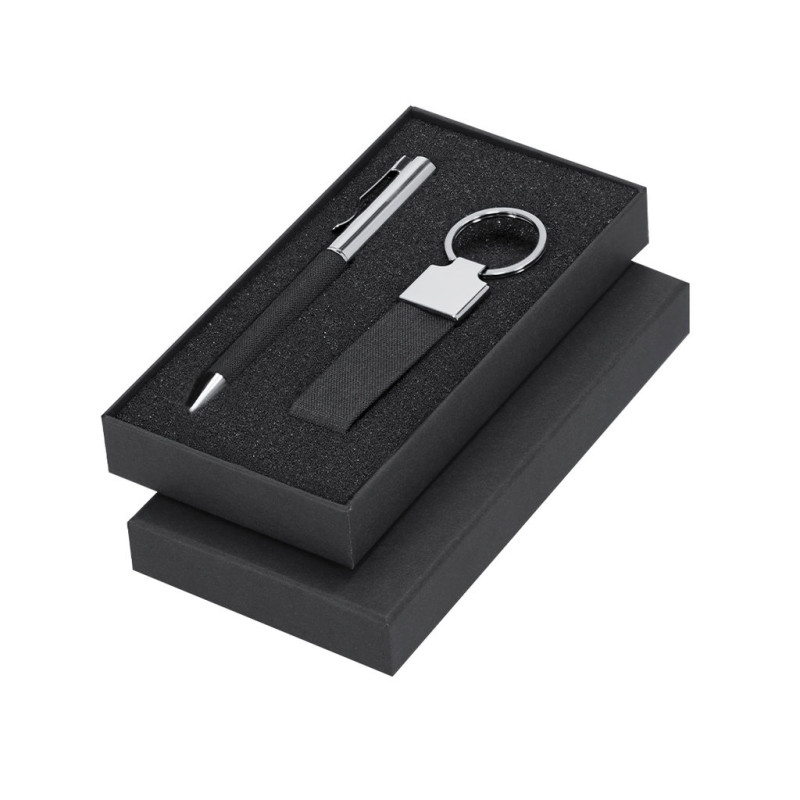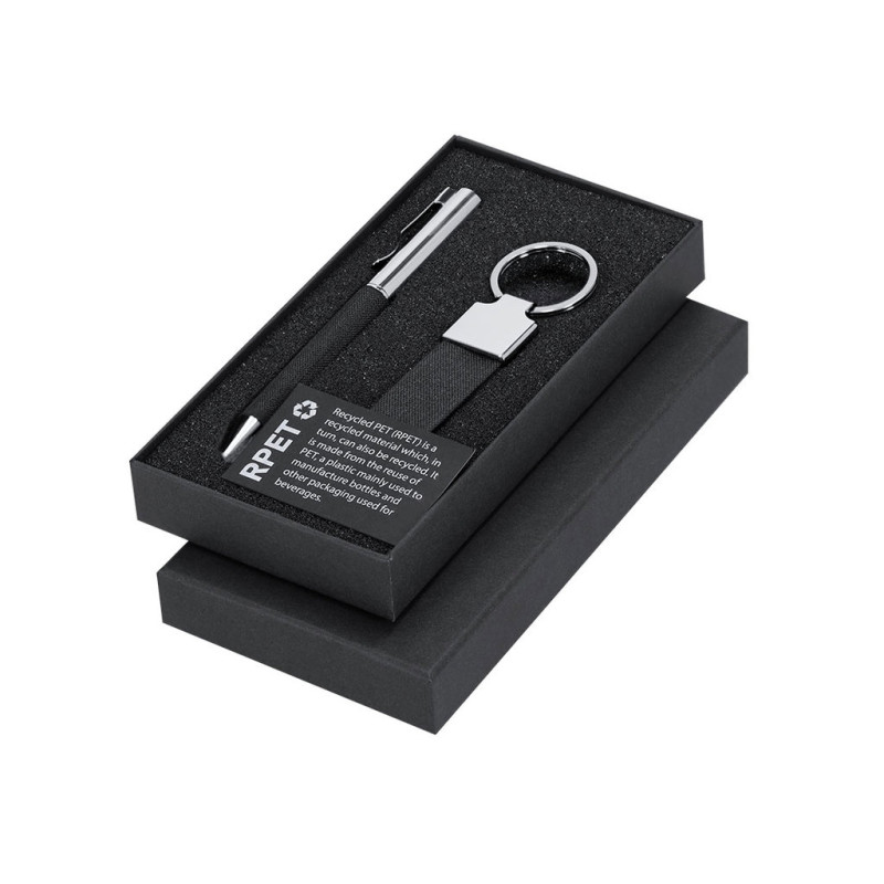 Elegant set in RPET with black bitone finish and metallic details. Includes:-RPET pen with black bitone finish and metallic details. With rotating mechanism and blue ink.-RPET keychain with black bitone finish and chrome accessories.Presented in an individual black case. Includes a black inner card with RPET label.RPET material is made from recycled plastic to promote the reuse of plastic waste and help the sustainability of the planet.