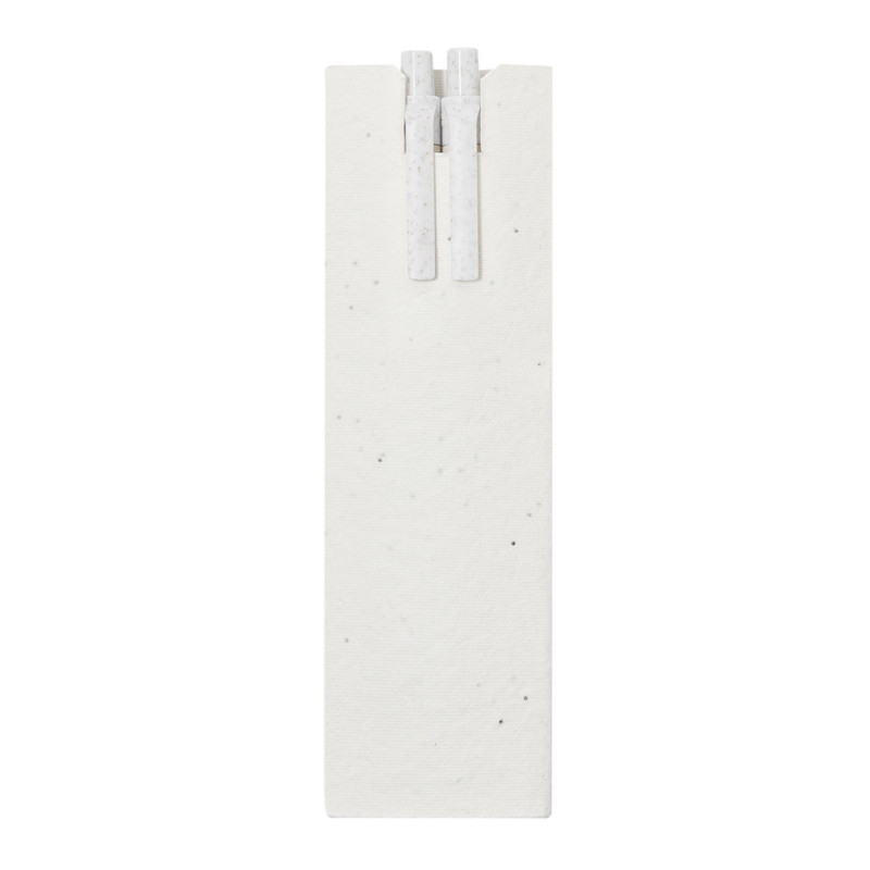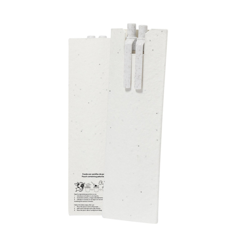 Set of pen and everlasting pencil made from recycled milk cartons, presented in a seed paper case. Blue ink pen and pencil with an everlasting tip, allowing for use of the same pencil without generating waste, both with push mechanism and matching clip made from Wheat Straw, with an engraved emblem. Featuring a recycled milk carton emblem on the body. The case includes petunia seeds, turning it into plantable paper at the end of its useful life. Planting instructions included on the back cover.Milk Cartons consist mainly of cardboard and aluminum. During their recycling process, the different materials of the packaging are separated for reuse and new applications, thus contributing to the endless path of the circular economy. This material is characterized by its high recyclability as well as its lightness and strength.Wheat Straw promotes the use of natural raw materials, thereby reducing harmful emissions.