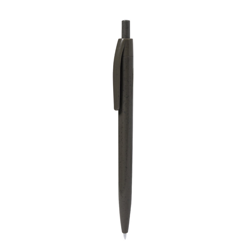 Ballpoint pen made from coffee fiber. Push-button mechanism and blue ink. Includes a coffee fiber label.Coffee fiber is a circular solution obtained from the use of waste produced during coffee processing. A sustainable alternative that helps reduce plastic use, saving energy in its manufacturing process and contributing to environmental protection.