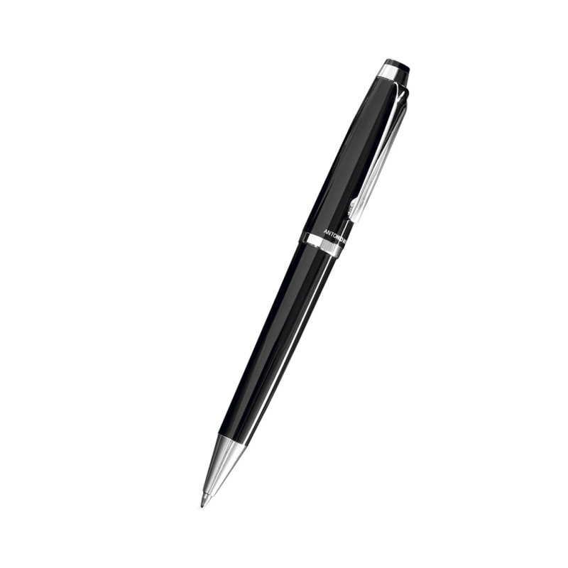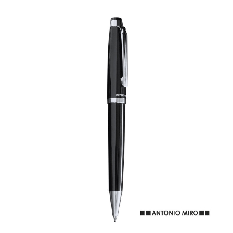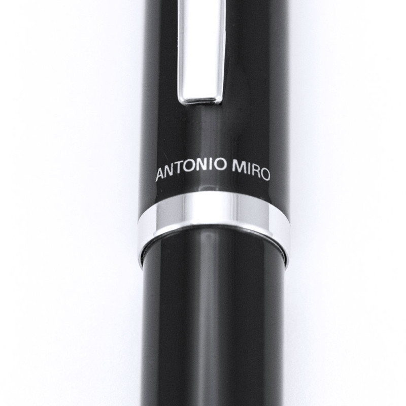 Ball pen by Antonio Miró in an elegant bicolor design and soft metallic body in sober black. With the brand logo on top of the ring, clip and tip in shiny silver finish. Presented in an individual black box with the brand logo. Jumbo cartridge with blue ink.