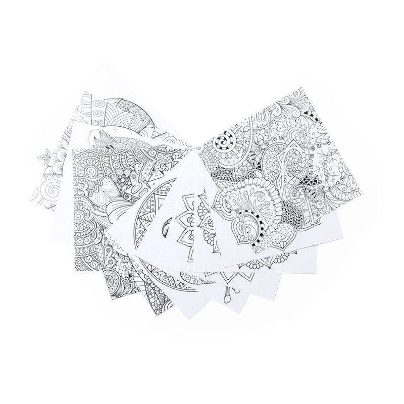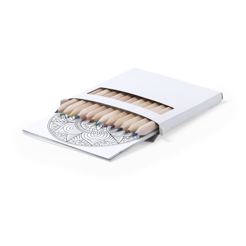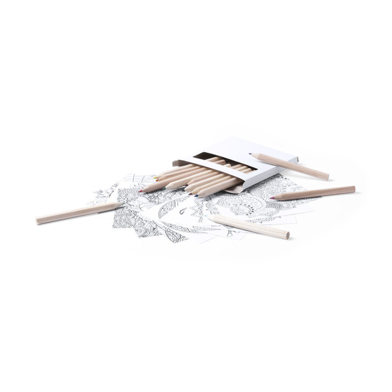 Set of pencils and coloring sheets with mandala designs to color and relax. Includes 12 hexagonal body pencils and 12 sheets with different designs. Presented in cardboard box with window.