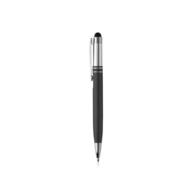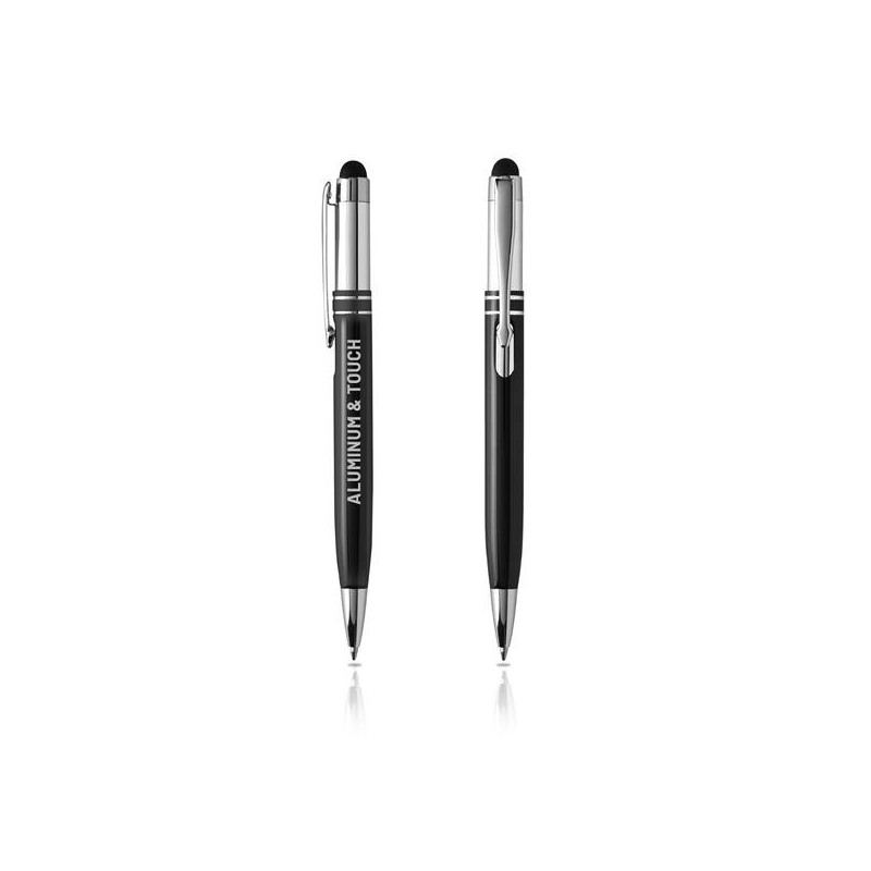Aluminum ballpoint pen, touch. Black writing, push system. Classic ballpoint pen with silver accents. Two rings next to the clip. Touch included. Ideal for engraving your brand on a gift that balances between the common ballpoint pen and the elegance of metal and shiny details.