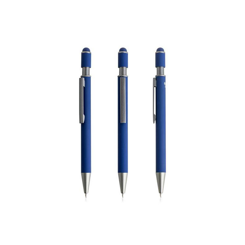 Ballpoint pen with a body made of recycled aluminum with a rubberized finish, combining comfort and environmental commitment. Features a push-button mechanism with a tactile top — ideal for interacting with touch screens. The integrated spinner on the top is the perfect detail for moments of relaxation, relieving stress during use. Smooth blue ink writing, combining modern design, functionality, and sustainability in a single product.
