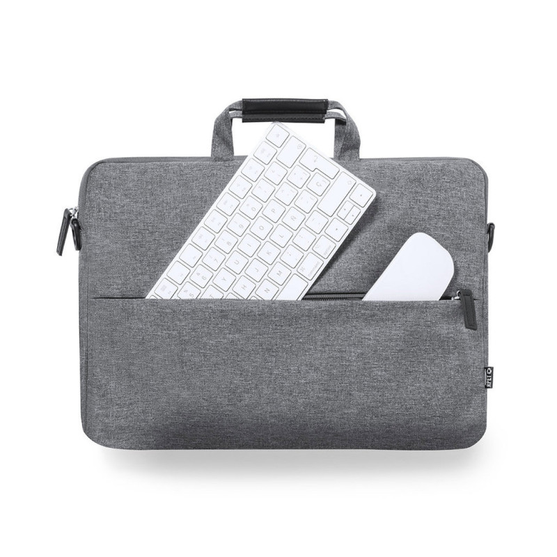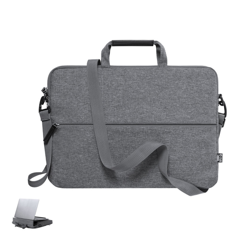 Document holder in nature line and in resistant 300D RPET melange effect, made from recycled plastic, in order to promote the reuse of plastic waste and contribute to the sustainability of the planet. With innovative, integrated laptop holder. Main and front pockets with zip closure. Inside with padded laptop pocket for up to 15 inches laptops and pocket for up to 10 inches tablets. Adjustable shoulder strap with reinforced carry handle. Resistance up to 6kg, with RPET emblem on outside label.