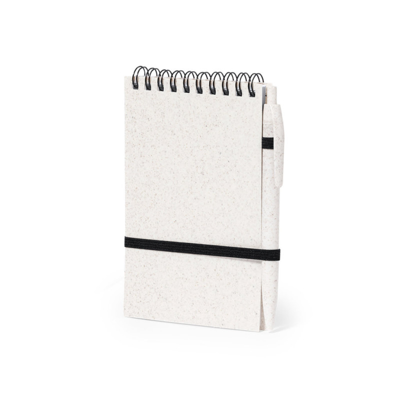 Set of ring notebook with wheat straw covers and matching ball pen, also in wheat straw. Compact size, with elastic closure in elegant black. Including 70 sheets with single-striped layout and eco design. Push-button mechanism ball pen in blue ink, with Wheat Straw logo. Presented in an individual recycled bag.Made with vegetal elements to encourage the use of natural raw materials and reduce pollutant emissions.