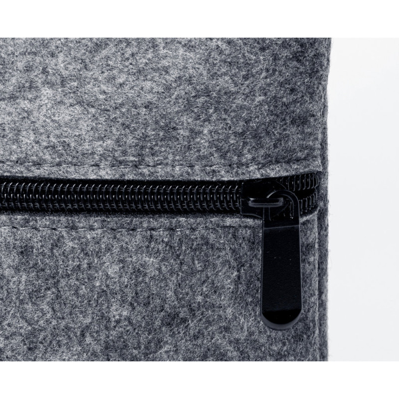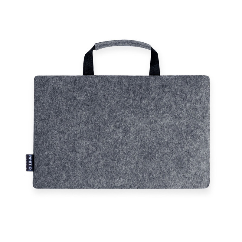 Document holder in durable RPET felt melange effect. Zipped main compartment for laptops up to 15 inches, and a small inner pocket. Durable matching handles with black color details. RPET badge on outer label.RPET felt is the result of the combination of the recycling processes of plastic materials along with the millenary technique of felt manufacturing, resulting in an eco-trend material that, in addition to being of recycled origin, also becomes recyclable.