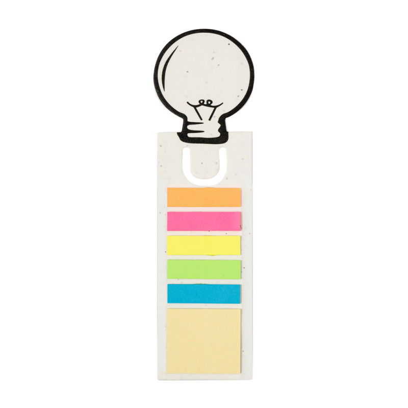 Cool bookmark made of seed paper, with a distinctive light bulb design. With sticky notes in various shapes and colours: 15 sticky notes 4x4.5 cm in yellow and 75 mini sticky notes 1.2x4.5 cm in five different colours. The paper includes petunia seeds, making it plantable paper at the end of its lifespan. Including planting instructions on the back cover and comes in an individual recycled paper bag.