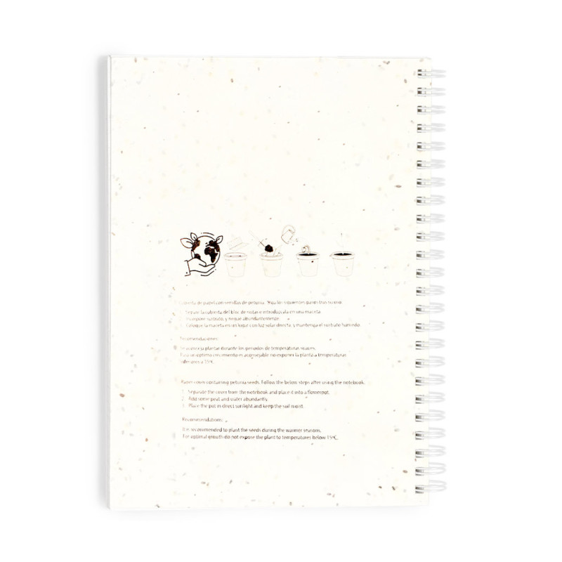 Ring binder notebook with soft covers made of seed paper. With 80 plain white sheets. The covers include petunia seeds, making it plantable paper at the end of its lifespan. Including planting instructions on the back cover and presented in an individual recycled paper bag.